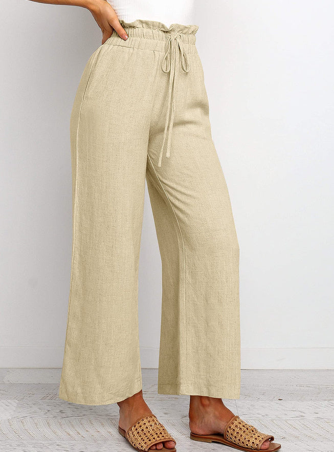 Elastic Waistband Lace-up Wide Leg Pants Solid Color Cropped Pants